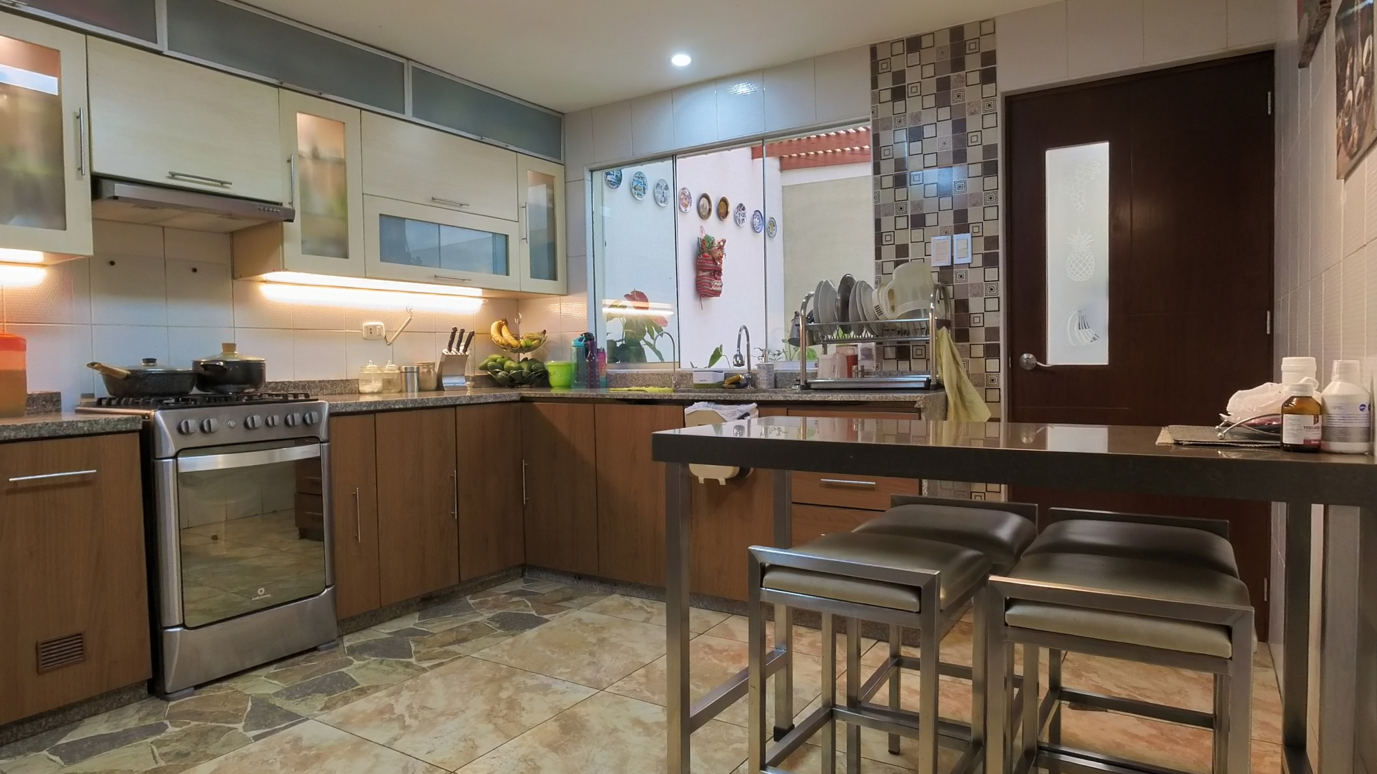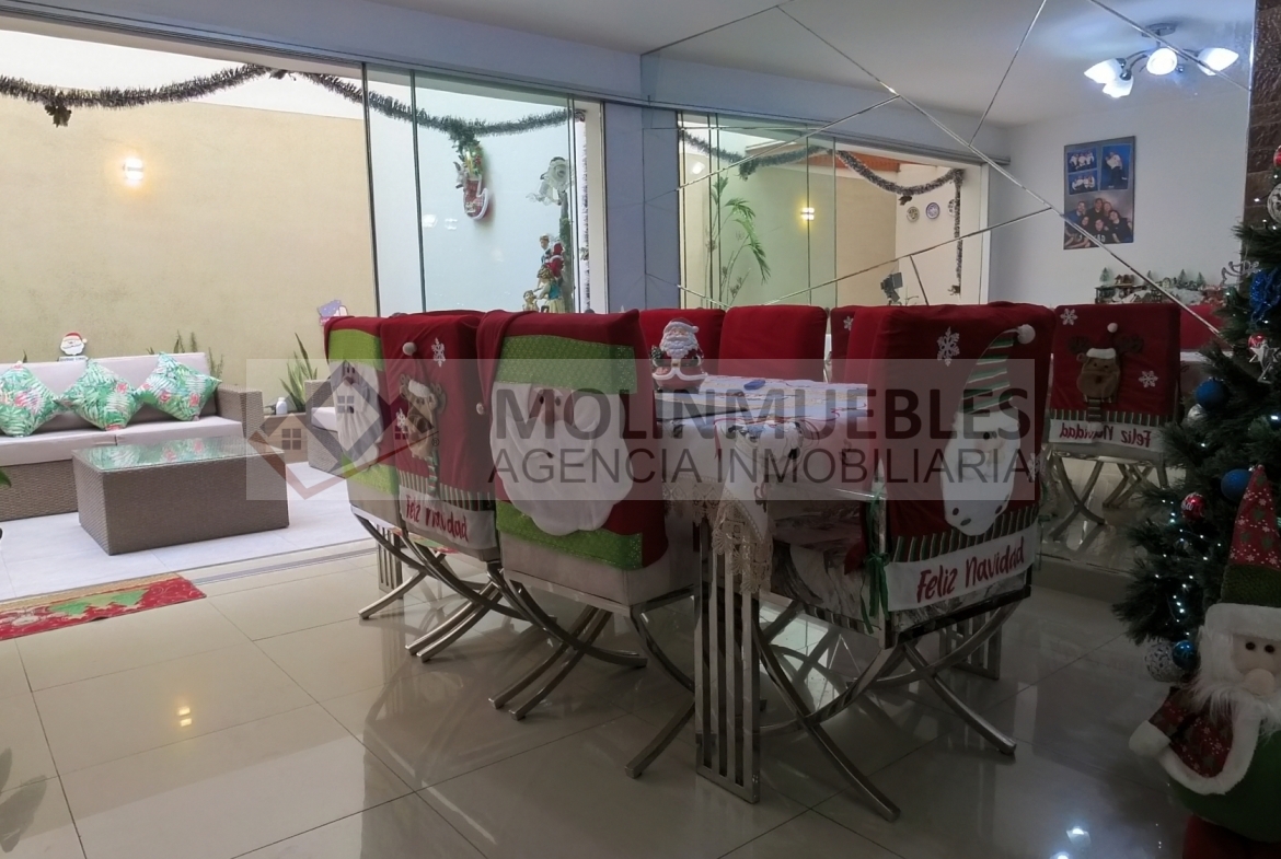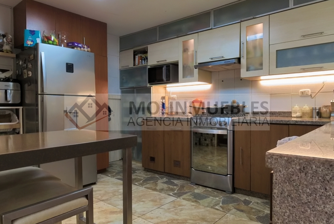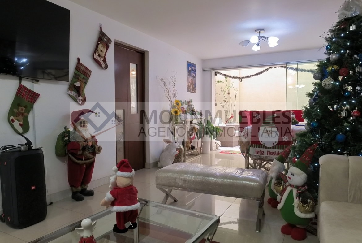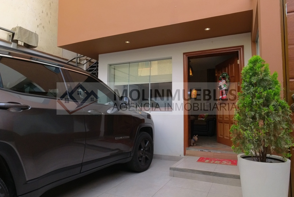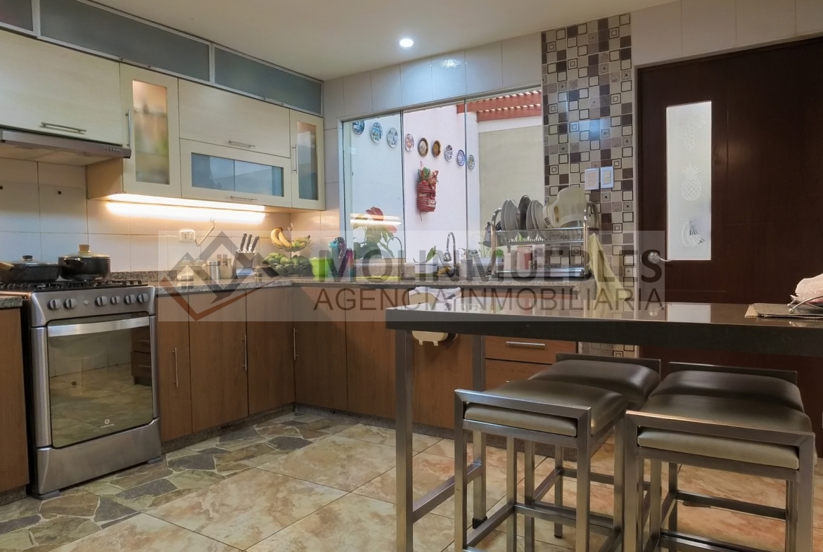En el primer piso encontramos 1 dormitorio o estudio con baño incorporado, una amplia cochera para dos vehículos, 1 sala de estar , sala comedor amplios muy iluminada con vista a la terraza, ½ baño de visita, cocina amoblada con reposteros altos y bajos, tablero de granito y una Isla para tomar desayuno u otros alimentos, amplia lavandería y alacena o depósito.