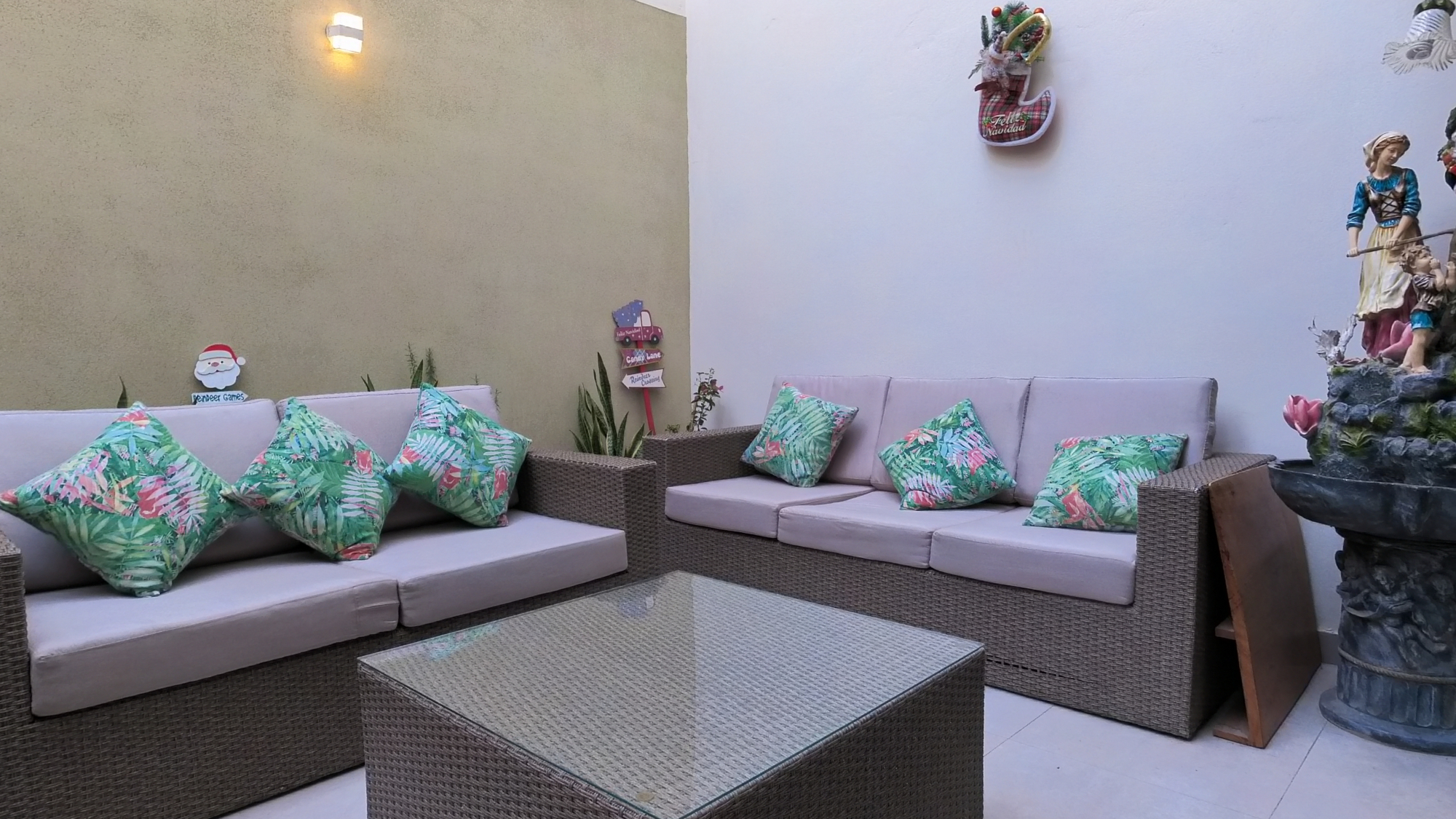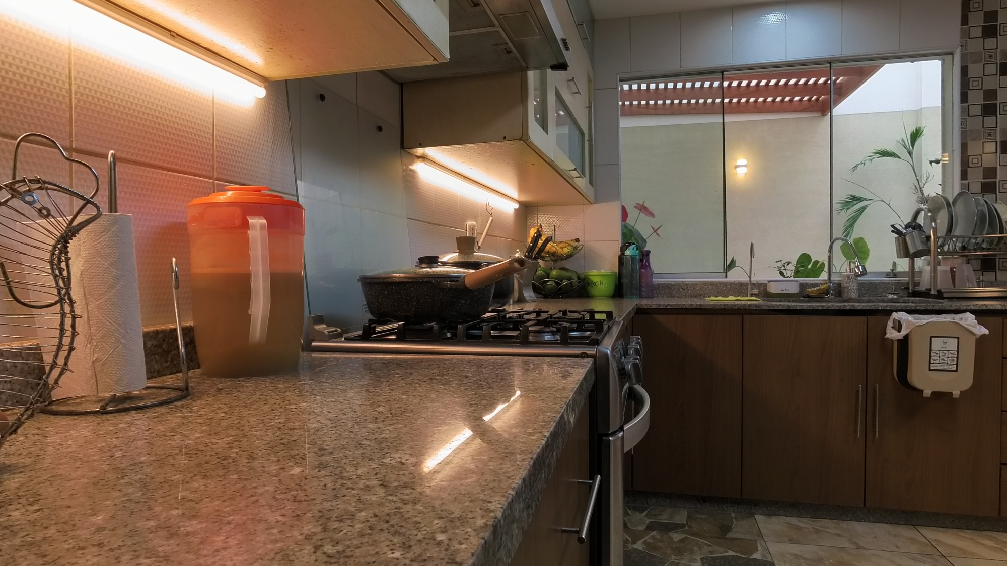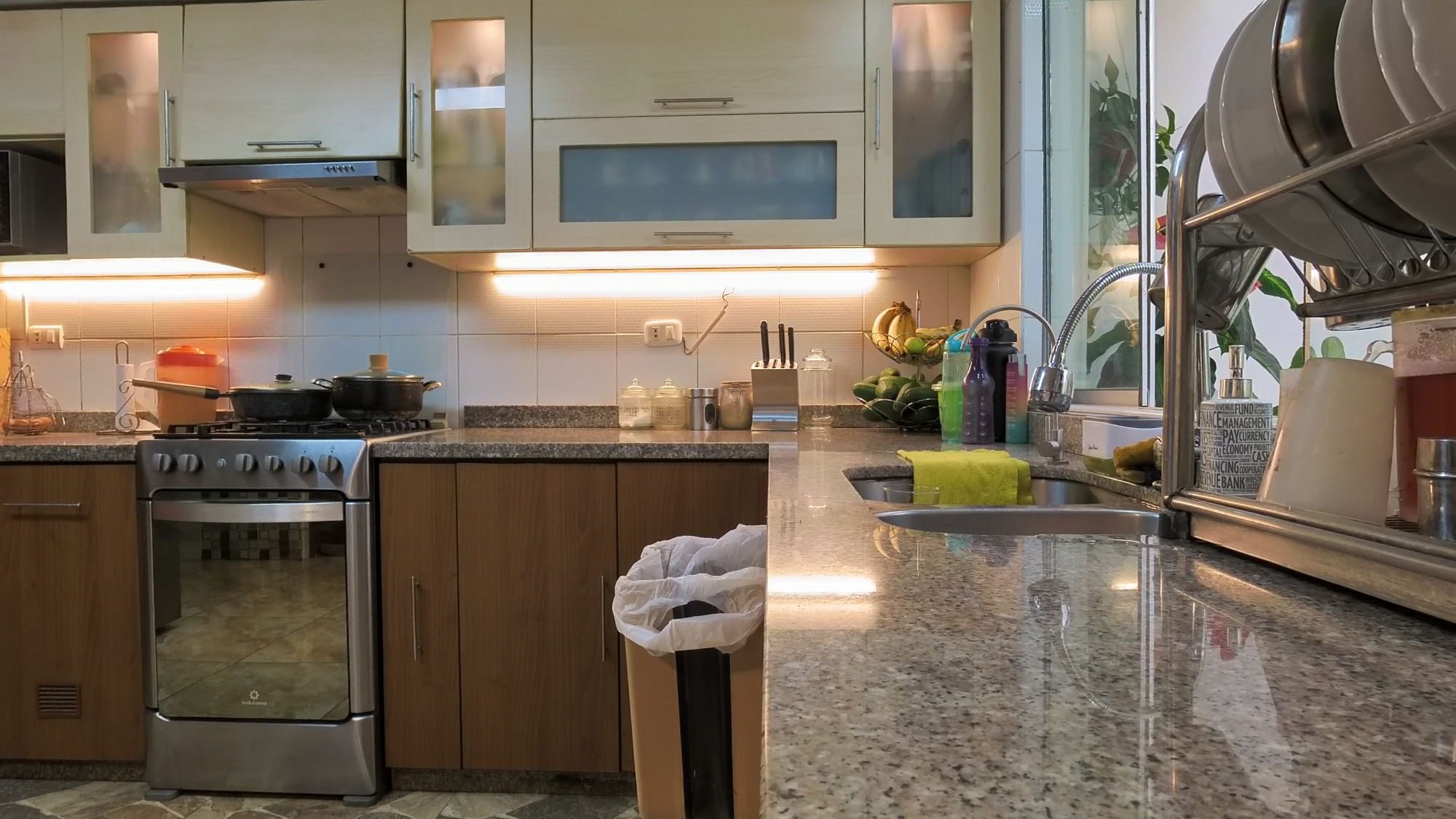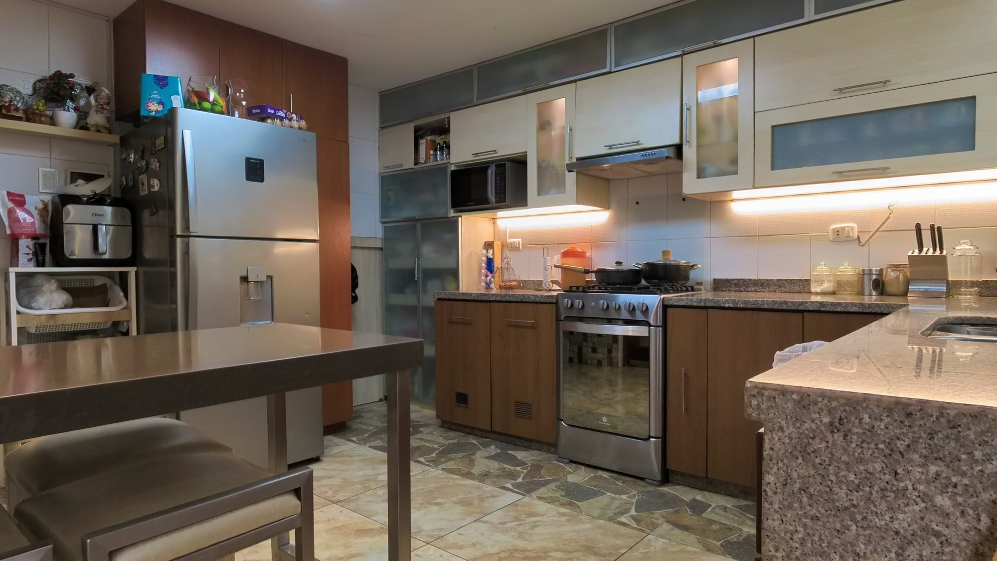En el primer piso encontramos 1 dormitorio o estudio con baño incorporado, una amplia cochera para dos vehículos, 1 sala de estar , sala comedor amplios muy iluminada con vista a la terraza, ½ baño de visita, cocina amoblada con reposteros altos y bajos, tablero de granito y una Isla para tomar desayuno u otros alimentos, amplia lavandería y alacena o depósito.
